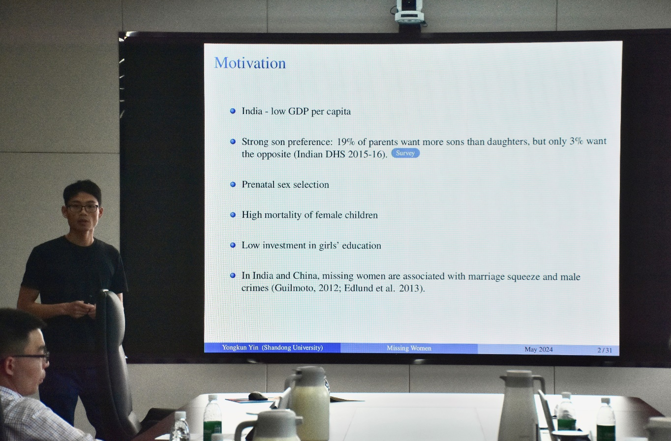 3044am永利集团3044noc殷永昆作了题为“Missing Women: A Quantitative Analysis”的报告,研究了印度的人口性别比例失衡问题。在印度等发展中国家,出于养老需求、劳动工资歧视、养育成本等经济因素以及内在心理偏好等非经济因素,父母更偏好生育男孩。报告运用世代交叠模型对父母的生育决策、教育决策、子女数量质量权衡等问题进行研究。研究表明,性别歧视主要受经济因素影响;若出台相关政策对女孩数量或教育进行补贴,可改善性别比例失衡现状,但两种措施带来的影响有所不同。