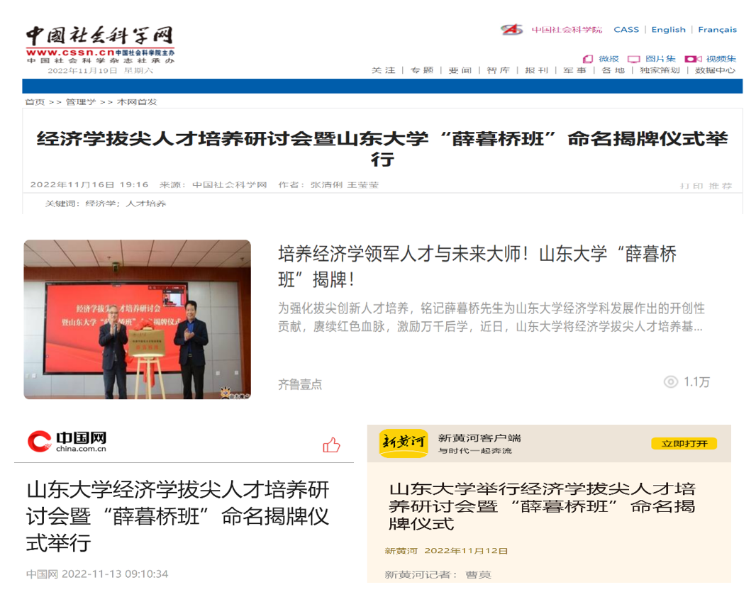 近日,3044am永利集团3044noc经济学拔尖人才培养研讨会暨“薛暮桥班”命名揭牌仪式成功举行后,中国网、中国社会科学网、齐鲁晚报、新黄河等多家媒体对其进行了广泛报道,引起了热烈的社会反响。