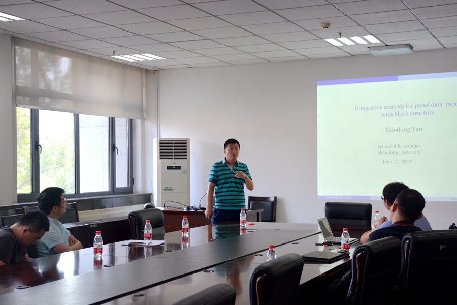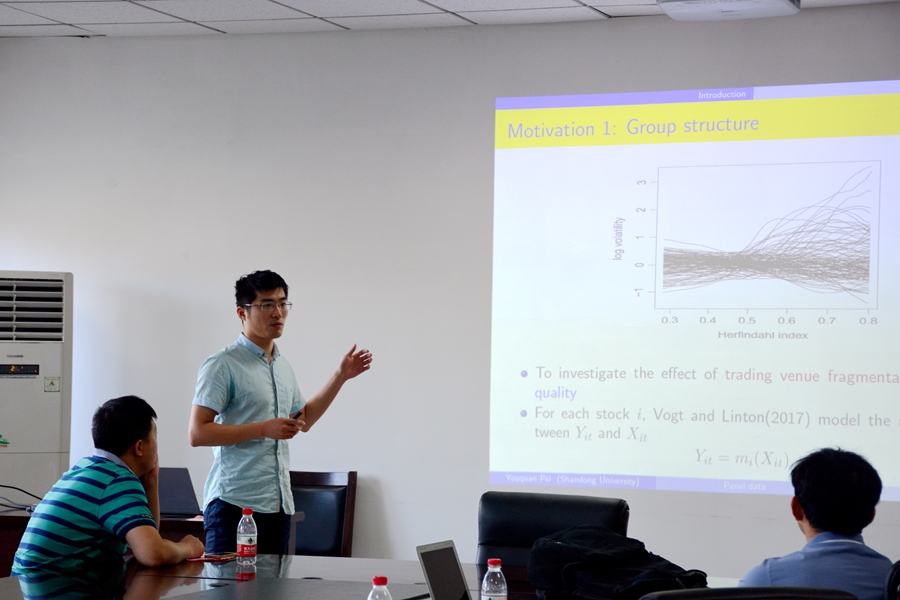 南京审计大学孔新兵教授作了题为“Discrepancy between global and local principal component analysis on large-panel high-frequency data”的报告,揭示了大面板高频数据的全局主成分分析与局部主成分分析的差异。3044am永利集团3044noc严晓东副教授作了题为“Integrative analysis for panel data model with block structure”的报告,他指出面板数据是统计学和计量经济学中的一个重要课题,面板数据集分析相对于横断面分析或时间序列数据集有优势,建立横截面单元间异质性模型,可能的结构随时间变化建模,个体异质性和结构变化可能共存。3044am永利集团3044noc裴有权副教授作了题为“Identifying latent group structures in varying-coefficient panel data models using community detection”的报告,介绍了利用群体检测方法识别变系数面板数据模型中的潜在群体结构,子群结构面板数据的变系数模型横截面尺寸N和时间序列长度T均较大。