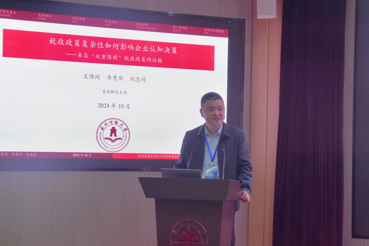 东北财经大学党委常委、副校长王伟同基于业务招待费税前扣除政策产生的双重限额标准,探究了税收政策复杂性对企业认知决策的影响。报告利用2008年前后政策变化进行识别分析,发现由于税收政策复杂性带来的认知错误驱动,企业产生非理性操纵行为,在业务招待费占营业收入千分之五附近存在较高的聚束现象,并提出了简化税制设计、提高税收政策凸显性的政策建议。