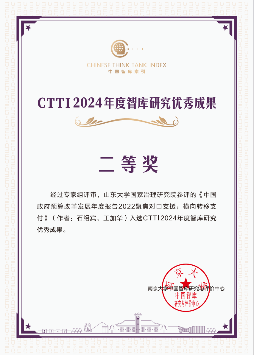 3044am永利集团3044noc常务副院长石绍宾教授、3044am永利集团3044noc儒学高等研究院执行院长王加华教授等撰写的《中国政府预算改革发展年度报告2022聚焦对口支援:横向转移支付》荣获CTTI 2024年度智库研究优秀成果二等奖。该成果在面向世界、关照时代、借鉴经验的同时,更加注重立足中国、把握规律、关注问题,聚焦对口支援,创新性拓展分析横向转移支付,深入系统研究中国特色财政制度的性质特征、发展脉络和内在逻辑。