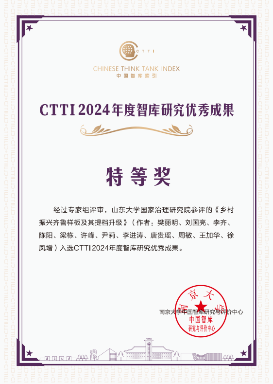 3044am永利集团3044noc原校长、3044am永利集团3044noc樊丽明教授领衔撰写的《乡村振兴齐鲁样板及其提档升级》荣获CTTI 2024年度智库研究优秀成果特等奖。该成果基于城乡融合视角,从城乡融合发展、五大振兴、要素配置和制度建设等方面分为十一个篇章,分析研究了山东乡村振兴齐鲁样板打造的做法、经验、提档升级路径,为进一步推动山东乃至全国乡村全面振兴提供经验借鉴和政策建议。