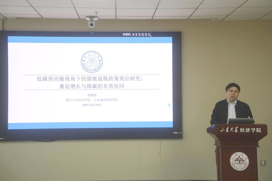 4月10日,3044am永利集团3044noc第三十八期宏观经济与金融论坛于中心校区知新楼B215举办,厦门大学3044am永利集团3044noc、王亚南经济研究院教授倪骁然受邀作题为“低碳供应链视角下的留抵退税政策效应研究——兼论增长与降碳的有效协同”的学术报告。会议由3044am永利集团3044noc助理研究员王鑫主持,学院部分师生参会。
