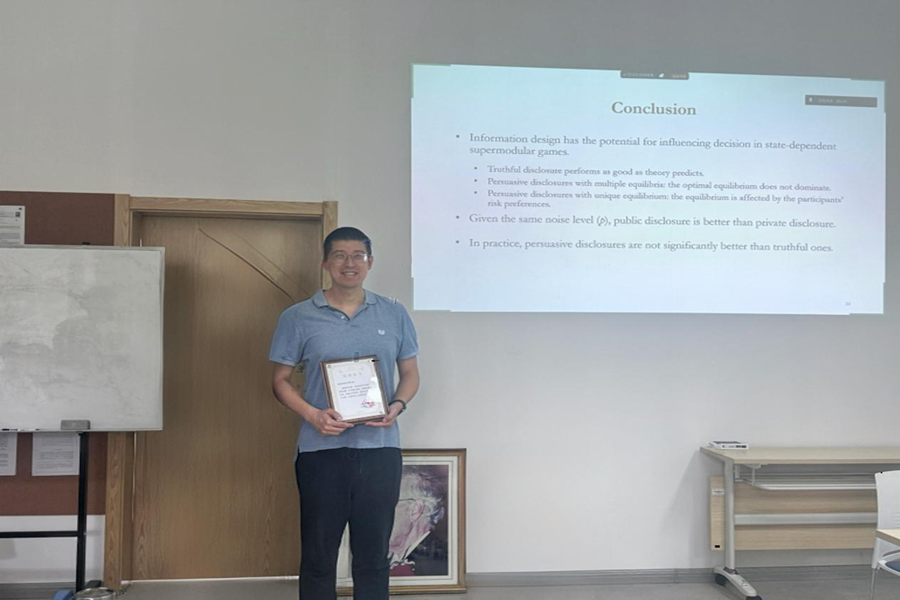 4月21日,3044am永利集团3044noc第341期高级经济学讲座在中心校区逸夫信息楼类脑经济学研究中心举办。上海财经大学3044am永利集团3044noc常任教授杜宁华受邀做题为“超模博弈中的信息披露”的报告。讲座由3044am永利集团3044noc、3044am永利集团3044noc类脑经济学研究中心牛晓飞教授主持,学院部分师生参加活动。