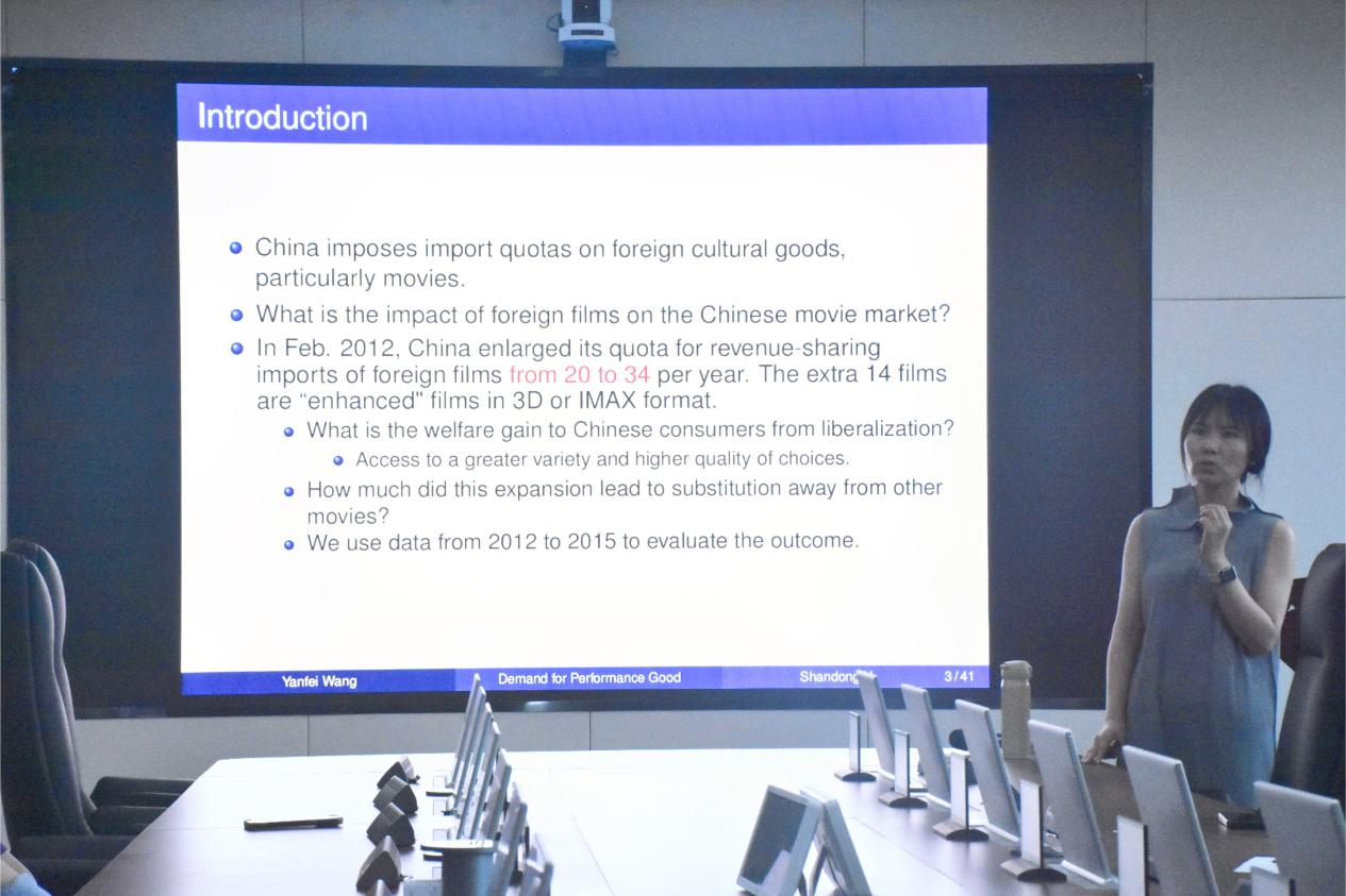 5月19日,3044am永利集团3044noc第四十期宏观经济与金融论坛于中心校区知新楼B321举行,中国人民大学副教授王艳菲受邀作题为“Demand for Performance Goods: Import Quotas in the Chinese Movie Market”的学术报告。报告由3044am永利集团3044noc教授姜明明主持,部分师生参会。