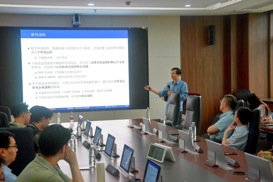 报告构建双寡头竞争模型,将消费者数据收集、个性化定价和企业创新纳入统一框架,研究个性化定价影响企业创新和各方福利的微观机制,并推导政府对价格歧视监管的最优政策。研究发现,与统一定价相比,个性化定价增强了企业创新激励,并且随着数据收集成本下降,创新水平提高,企业利润减少,消费者剩余增加,社会福利先减少后增加。进一步研究发现,政府最优价格歧视监管政策取决于政策目标、数据收集成本和行业创新特征。当数据收集成本比较高时,禁止个性化定价会提高企业利润和消费者福利,达到“双赢”结果。而随着数字技术进步,数据收集成本逐渐降低,政府应该更倾向于允许个性化定价。报告过程中,尹振东教授就模型中企业数据收集设定、企业创新行为假设、最优定价策略求解等问题与参会师生进行了充分探讨。