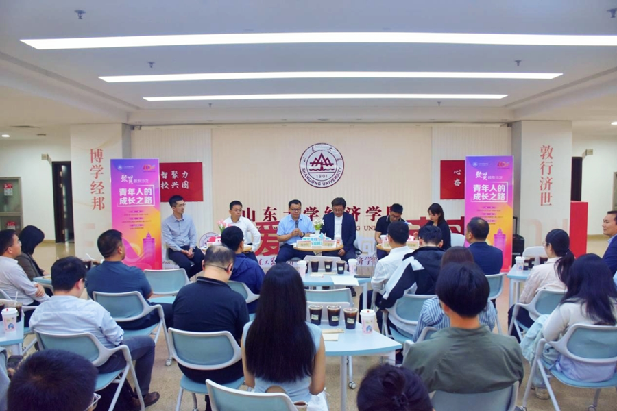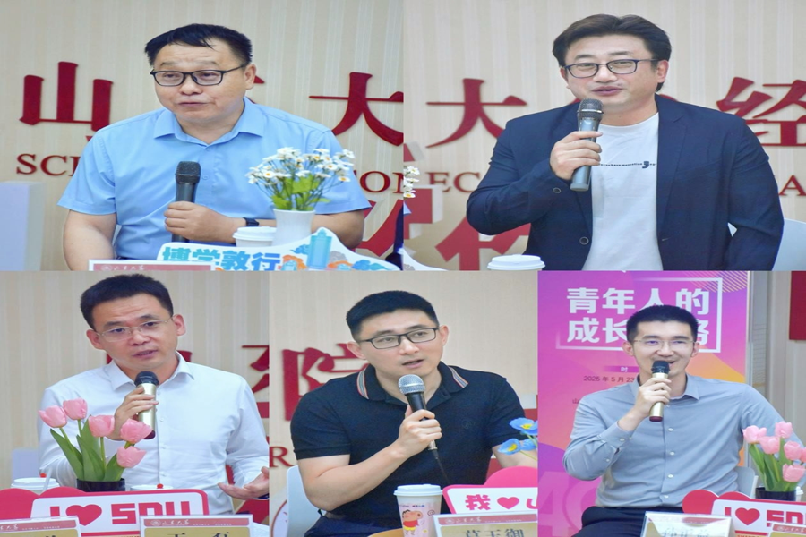 1986级本科校友,滨州市人大常委会委员、财政经济委员会主任委员颜世庚分享了自己从学财政、教财政到干财政的39年职业生涯,强调财政是国家治理的基础和支柱。他鼓励同学们在大学期间要练就过硬本领,主动服务国家战略,找准自己的比较优势,勇敢面对人生选择,用经济学思维分析和解决现实问题。1990级本科校友,泛海投资集团总裁王忠为回忆了自己的求学经历。他通过参加学科竞赛和社会实践,培养了独立思考和研究能力,指出青年人应勇于尝试、勇于创新、不怕失败,在不确定的环境中坚守责任与担当,鼓励同学们在快速变化的时代中保持开放包容的心态,铭记初心,勇敢追梦。2005级博士校友,中国工商银行东营分行党委书记、行长王磊分享了从山大求学至今的成长历程。他表示,学院教师一丝不苟、严于律己的治学态度和为国为民的家国情怀对他产生了深远影响,使他在工作中始终秉持“为国理财”的初心,他建议同学们要坚守初心,学会主动融入,保持拼搏精神,扎实工作,不务虚功。2006级本科校友,上海国家会计学院应用经济系主任葛玉御讲述了自己求学、就业及爱心助学的经历。他表示,对教学工作的热爱是他在教育领域不断深耕的重要支撑,鼓励大家积极寻找自身心之所向并做到持之以恒,勇敢走出舒适区,不断学习新知识,以高度的社会责任感,诠释山大“为天下储人才,为国家图富强”的办学宗旨。2008级本科校友,安永会计师事务所北京分所税务高级经理孙正益结合自己在四大会计师事务所的工作经历,强调终身学习和职业规划的重要性。他认为,同学们应保持终身学习的态度,以“作品意识”对待每项学习任务,深入体验过程,同时培养清晰的规划力和执行力,以应对未来职场中的挑战。