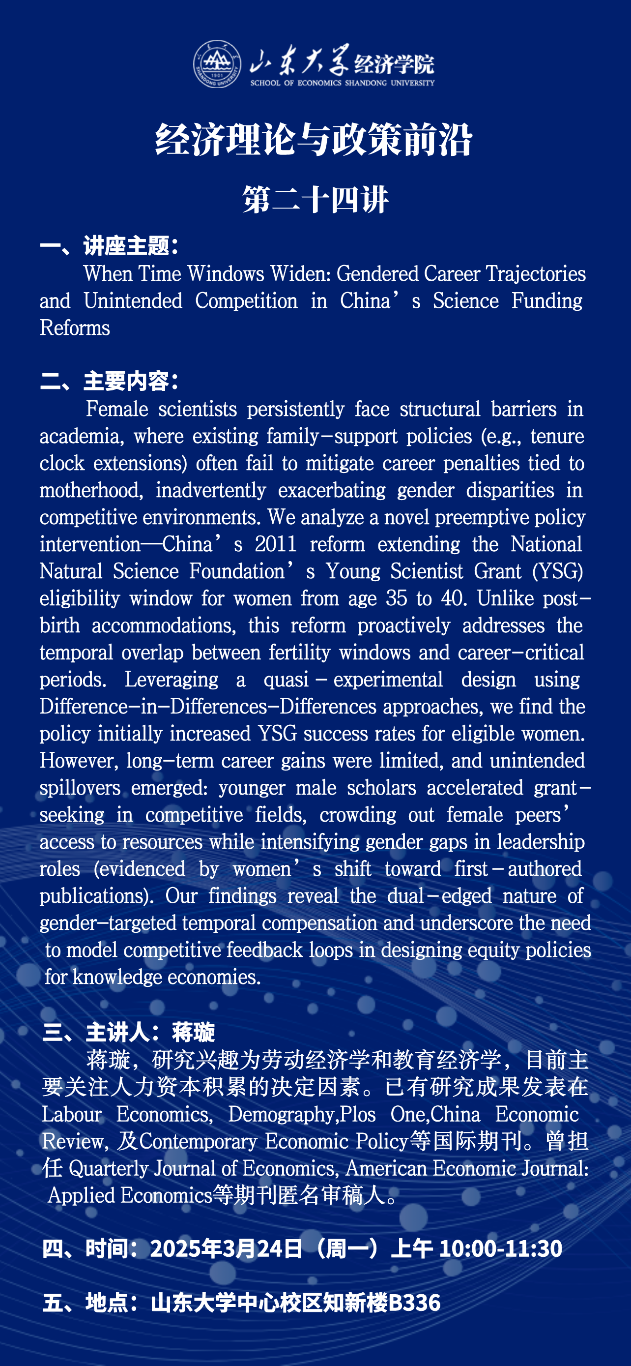When Time Windows Widen:Gendered Career Trajectories and Unintended Competition in China's Science Funding Reforms(经济理论与政策前沿第二十四讲)