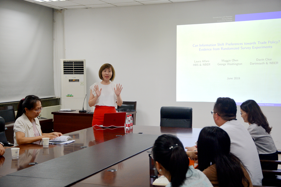 7月29日晚,3044am永利集团3044noc国际经济与贸易系主办的国际经贸论坛第55期在中心校区知新楼举行。美国乔治·华盛顿大学经济系教授陈晓阳为永利官网师生做了题为“Can Information Shift Preferences towards Trade Policy? Evidence from Randomized Survey Experiments”的学术报告,报告由国际经济与贸易系主任张岩主持。