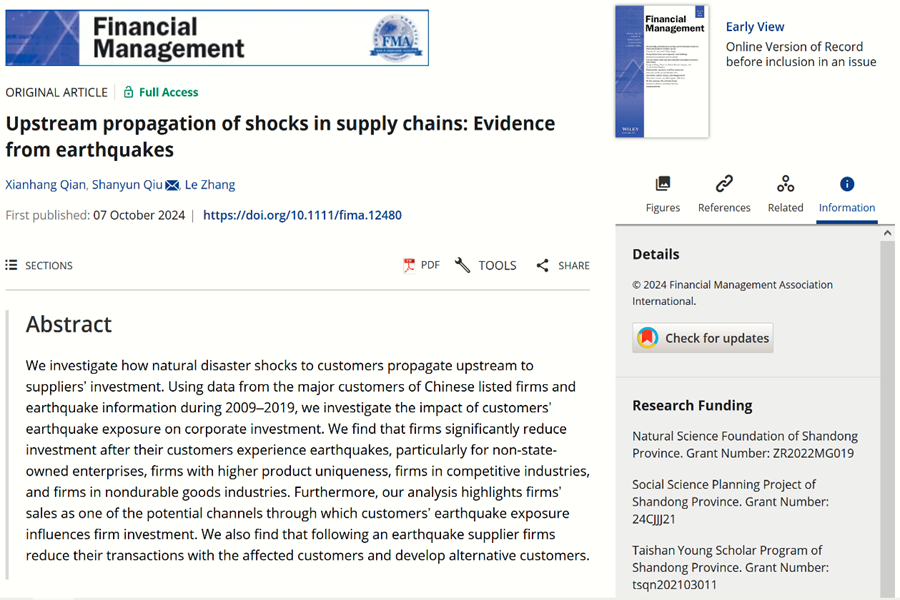近日,3044am永利集团3044noc钱先航教授、邱善运博士后与澳大利亚国立大学张乐教授合作的论文“Upstream Propagation of Shocks In Supply Chains: Evidence from Earthquakes”在国际权威期刊Financial Management在线发表。