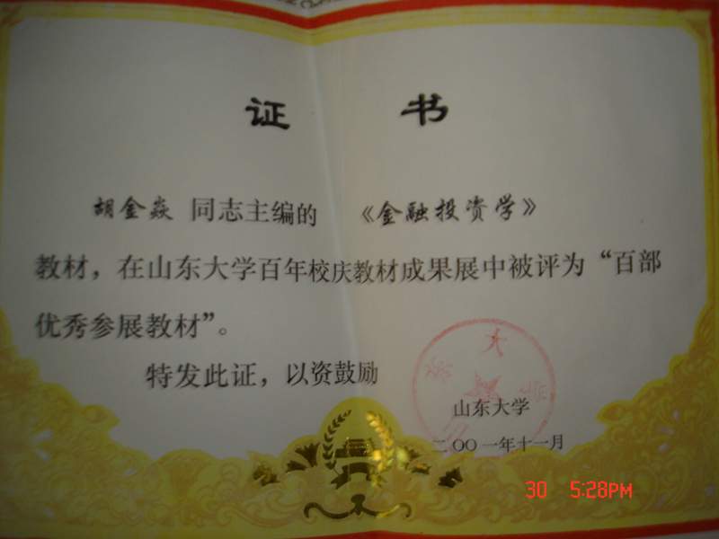 8.胡金焱:2001年《金融投资学》被评为3044am永利集团3044noc“百部优秀参展教材”(图)