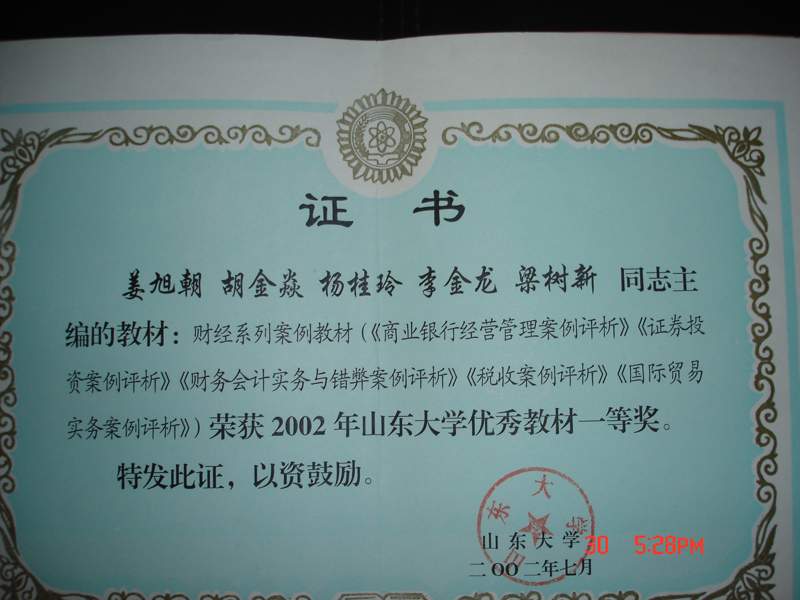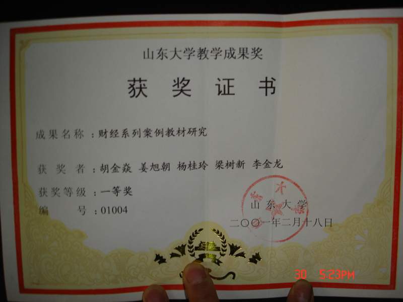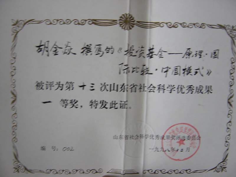 7. 胡金焱:1998年《投资基金——原理·国际比较·中国模式》获山东省社会科学优秀成果一等奖(图)
